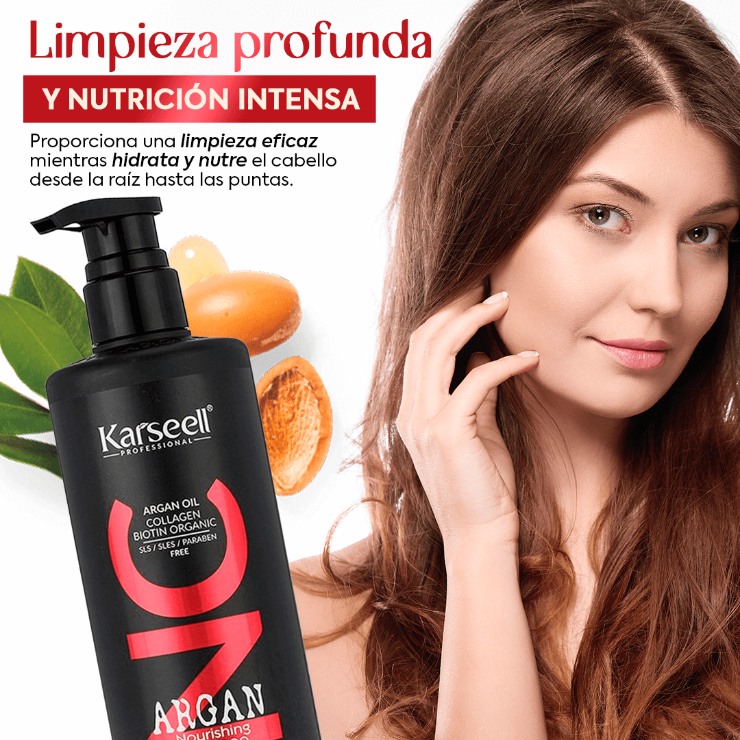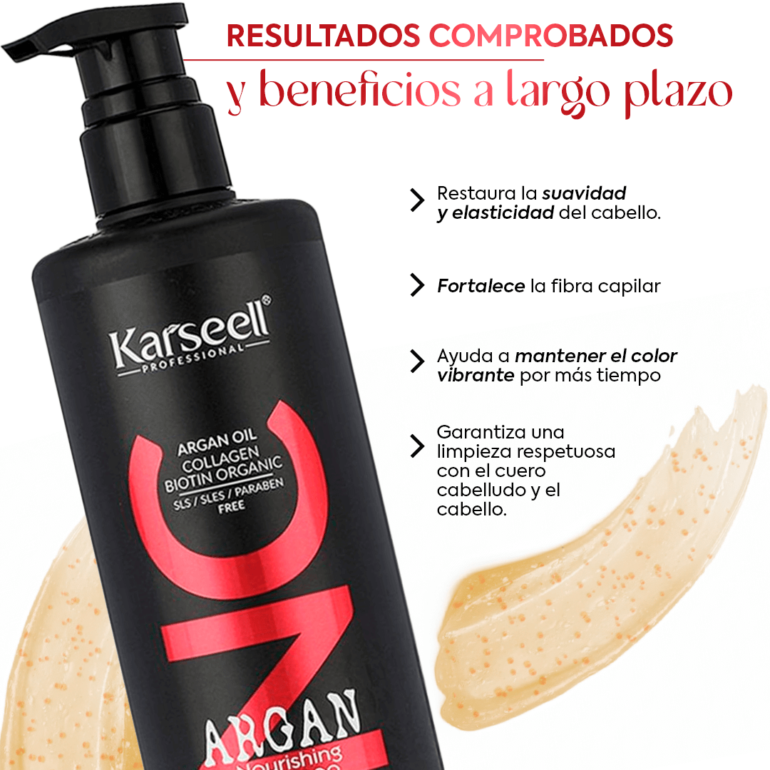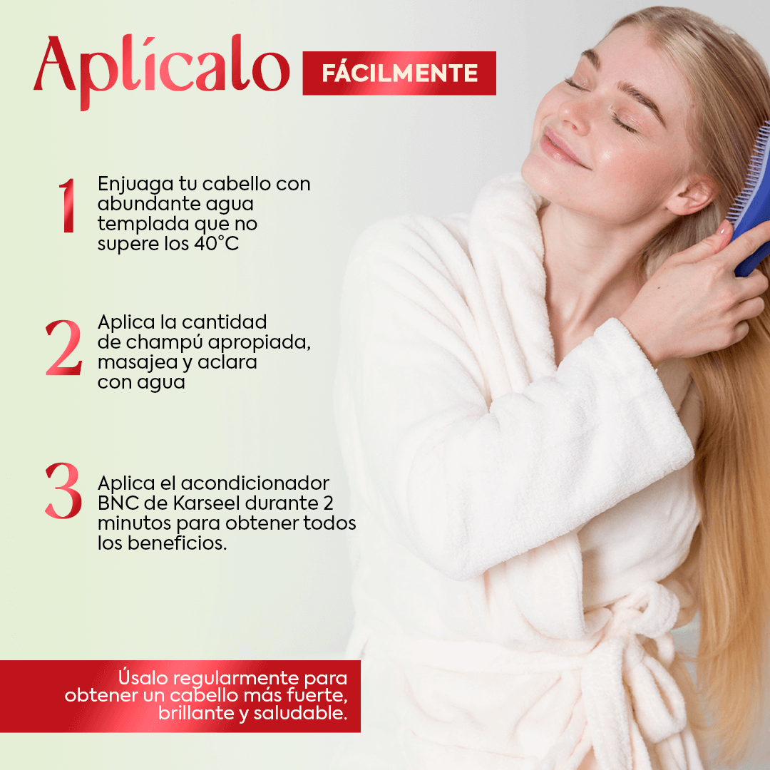 - Repite si es necesario y continúa con la Mascarilla o el Acondicionador Karseell para un resultado óptimo.