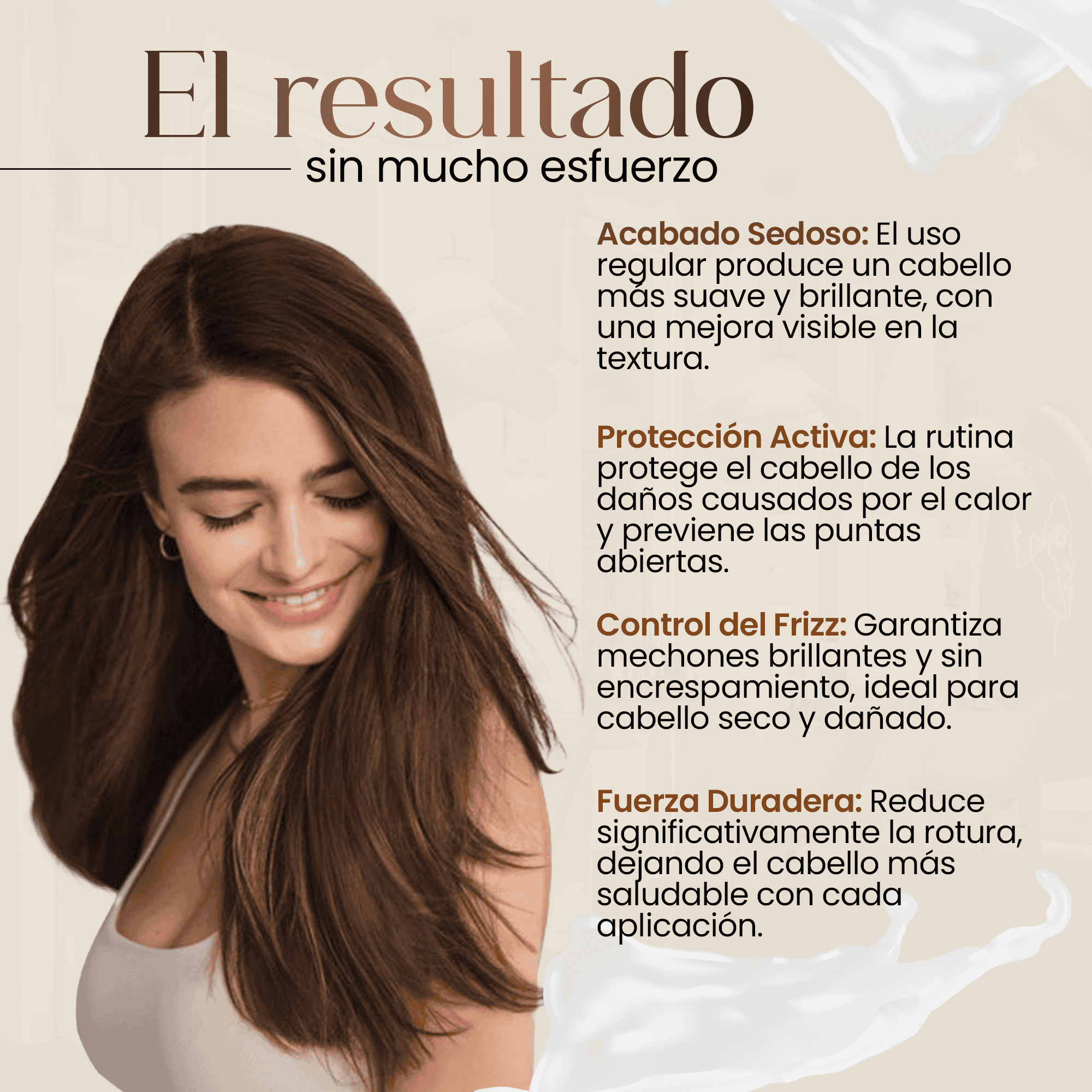Los productos están formulados para trabajar juntos; el champú abre la cutícula, la mascarilla repara y el aceite sella.